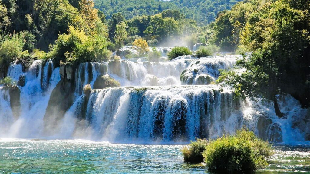 Ebenfalls gut erreichbar ist der Nationalpark Krka mit seinen spektakulären Wasserfällen und Holzstegen durch unberührte Natur. Hier kann man entlang der Flusslandschaft wandern, schwimmen oder die beeindruckenden Kaskaden bestaunen – ein Highlight für Naturliebhaber.